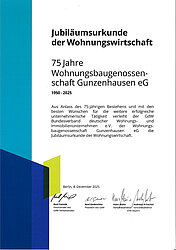 Anlässlich unseres 75-jährigen Bestehens wurden wir vom GdW Bundesverband deutscher Wohnungs- und Immobilienunternehmen e.V. mit der Jubiläumsurkunde der Wohnungswirtschaft ausgezeichnet. Die Ehrung würdigt 75 Jahre verantwortungsvolle, nachhaltige und erfolgreiche genossenschaftliche Arbeit von 1950 bis 2025 und verbindet dies mit den besten Wünschen für unsere weitere erfolgreiche unternehmerische Zukunft.