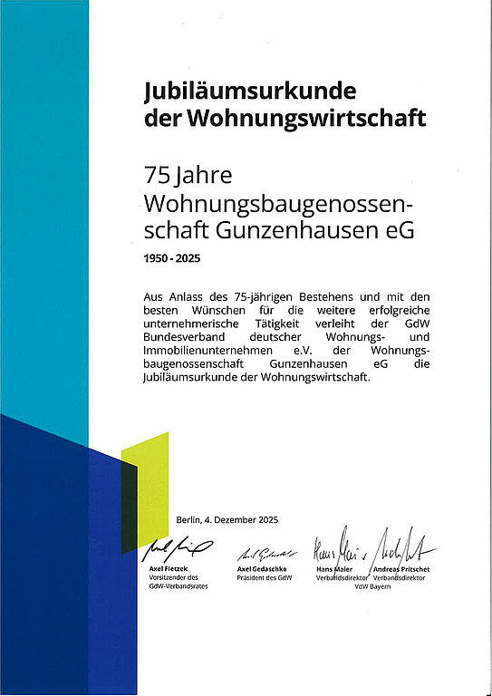 Anlässlich unseres 75-jährigen Bestehens wurden wir vom GdW Bundesverband deutscher Wohnungs- und Immobilienunternehmen e.V. mit der Jubiläumsurkunde der Wohnungswirtschaft ausgezeichnet. Die Ehrung würdigt 75 Jahre verantwortungsvolle, nachhaltige und erfolgreiche genossenschaftliche Arbeit von 1950 bis 2025 und verbindet dies mit den besten Wünschen für unsere weitere erfolgreiche unternehmerische Zukunft.